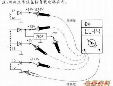 经多年的实践,我们整理出一套压降检测法。压降检测法就是运用数字的挡对电路中的进行测量,因二极管挡两表笔大约有2.65V的输出电压,而整流管正极均通过各绕组接地,这给检修带来方便,压降值见表2,测量方法如图所示。