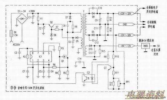 笔者选用“华争牌音响专用150W开关板”进行代换。该输出的主电压能从±22V到±32V调整,还有一路8—12V的副电压备用。代换时,首先拆除原机变压器,将开关电源上的主电压输出端与功放板的供电端对应相连。然后从开关电源的主电压输出正端接一引线连至面板显示屏及电子开关电路的供电端。最后从开关电源的副电压输出端经一只5V稳压块7805稳压后接到显示屏灯丝供电端(见附图)。因原机面板上有与前置电路相连的地线,故可不接地线。以防自激。