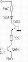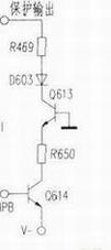 保护电路改动:见右图、上图。负MOS管过流保护取样电压为源极电阻。取样连接为G极与v-。改为三极管后,取样电压为型大功率管发射极负载电阻,取样连接为OUT与e极。负电源大功率管过流保护动作管Q614原为基极接Ipb,发射极接V-。现改为Q614的b极接OUT,e极接Ipb。