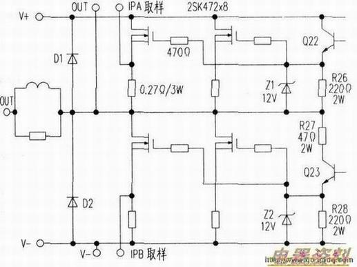 改装前要确定MOs管管脚排列2SK427管脚排列功能与A1943/C5200一致,可直接安装。大功率电阻不动,G极电阻原为470Ω,装三极管后改为100Ω,也可短接。原OUT—G之间的保护稳压值为12V,现改为3.3V.接法改正见下图。