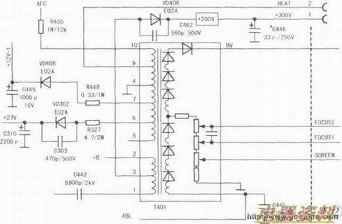 上门开壳检查。原型号为IF0101—0101,板上ABE,电路R425(10kΩ)、R341(120kΩ)、R321(100kΩ)均已烧毁,看来高压包是损坏无疑。此机是飞利浦机芯,与早期的TCL9328系列机芯几乎一模一样。其高压包损坏率较高,在高压包损坏的同时常伴随着ABL电路的R425、R341、R321烧毁,甚至集成块304(TDA3504)损坏。高压包IF0101-0101不难配,决定试用其他高压包改装。