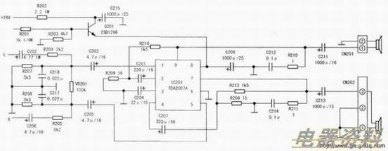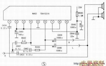 最后来试声音。发现音量很小且有严重的交流声。怀疑伴音集成块也烧坏了。此机的伴音功放块采用TDA2007A(见图4),9脚双声道集成块,比较少见。主要引脚功能如下:(1)脚L输入、(9)脚L输出、(5)脚R输入、(7)脚R输出、(8)脚接+18V、(6)脚接地。考虑再三,决定用长虹D2522型彩电用的9脚双声道集成块TDAl521A(见图5)来代换。其主要引脚功能如下:(1)脚L输入,(4)脚L输出,(9)脚R输入,(6)脚R输出,(7)脚接+22V,(5)脚接地,(2)、(3)、(8)脚连在一起通过一只100μF的电容接地。对比之后进行了如下更改:将TDA1521A(1)、(4)、(9)、(6)、(7)、(5)脚分别接入原TDA2007A的(1)、(9)、(5)、(7)、(8)、(6)脚,将(2)、(3)、(8)脚连在一起,通过一只100μF的电容接地,固定好后试机,故障排除。