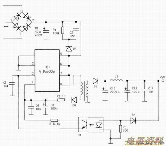 首先。将原机损坏及其他外围元件拆掉,只保留整流、尖峰吸收、原边18V,装上一块新的VlPer22A,并将其(5)—(8)四脚相连且与外围电路切断,连到经过开关后的300V,其(1)、(2)脚相连并与外围电路切断后。连到负端地,即47μF/400V负极。将其(4)脚与外围电路切断并连到原边整流后18V正极,在18V接一只5.1kΩ到光耦的c极,其e极连到VlPer22AC(3)脚,次级电路不用改动便能直接输出5v,其他各组电压和原来输出电压不变,这样就省去了改电源板接线的麻烦。而质量非常稳定,使用效果非常好(见图)。当有些个别的机子输出达不到5v时。只需对次级所接的取样稍作调整即可。