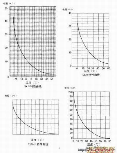 为了方便准确的代用。现给出5kΩ、10kΩ、50kΩ和250kΩ热敏电阻的特性曲线,见下图