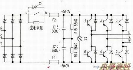 380V交流电整流后经过充电电阻对电解电容充电,当充到一定值(比如DC200V)辅助电源启动给控制板供电,让控制板工作从而继电器或晶闸管接通,充电电阻就不再工作了。在开机的瞬间,充电电阻越小,则流过整流桥的电流就越大。经常有初学变频器维修者打来电话咨询,更换了充电电阻,变频器一开机,整流桥马上就被炸掉了,是不是充电电阻选择太小了呢?答案是否定的。