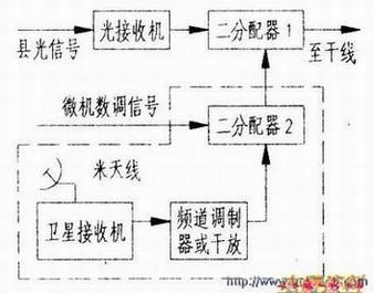 用一套1.5米卫星接收天线。一台杂牌数字接收机,加一台频道(如接收机有射频输出口的可不要器,但要一台干线放大器才能保证分配)。接收卫星上的中央电视1套节目,经一分配器将信号插入系统,及时解决了用户收看电视节目问题。上级节目源恢复,关掉卫星接收机和调制器。不拆此设备,供今后备用,不影响系统工作,不占用频道资源,器材易得,用资不多。操作简便,接法如图所示。