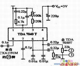 TDA7040T应用图l所示。解码后的立体声音频信号从⑤、⑥脚输出,再配上双,例如TDA7C150T,就可得到调频立体声。