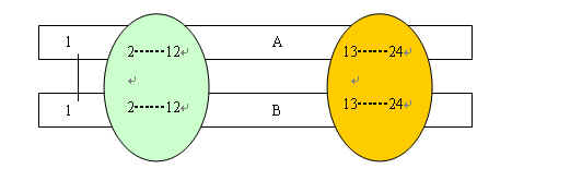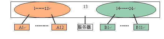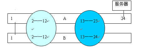 例3:交换机A的1端口与交换机B的1端口级联,交换机A的2—12口与交换机B的2—12可以互访,交换机A的13—23与交换机B的13—24可以互访,交换机A的24端口连接服务器,可以被所有端口访问。