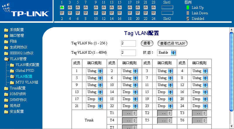 选择VLAN管理菜单下的VLAN配置选项,出现VLAN的具体设置,在Tag VLAN NO:(1-256)后面填入VLAN的顺序号,然后点击查看可以查看已设置的该VLAN的内容,在Tag VLAN ID:(1-4094)后面填入VLAN对应的VID值,可以在状态栏中选择Enable让此设置有效,选择Disable让此设置无效,选择delete删除已设置的VLAN。在成员和端口规则中设置每个端口对应的规则,每个端口对应三种规则:Untag、Tag、Drop。
