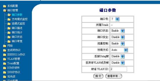 选择配置菜单下的端口管理,端口参数,出现每个端口的设置内容,如下图所示,在端口号的下拉列表中选择端口号,在缺省VLAN ID后面输入该端口对应的PVID值,每个端口的PVID值与它所要访问的VLAN组的VID是对应的。