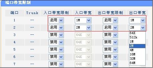 2、将端口1、2对应的入口、出口带宽限制由“禁用”改为“启用”。