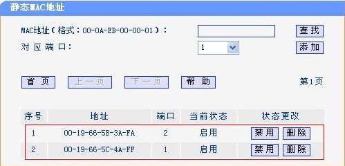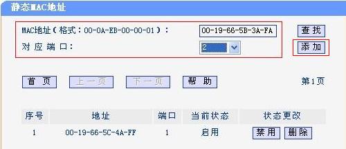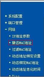 2、设置静态MAC地址绑定,选择“网络”--“静态MAC地址”,将电脑A、B的MAC地址与对应端口绑定。