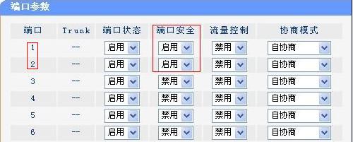 3、设置端口安全,将端口1、2所对应的“端口安全”选项由“禁用”改为“启用”,接着选择“提交”。