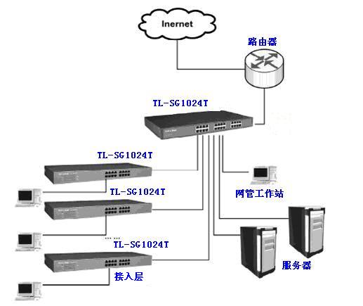 1、大中型网络环境:中心交换机采用三层交换机或管理型交换机,接入层使用TL-SG1024T,如下图: