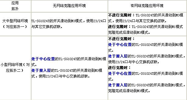 针对以上两种网络环境,如何调整TL-SG1024T的工作模式请参考下表: