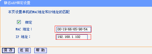 填入电脑的MAC地址与对应的IP地址,然后保存,就实现了IP与MAC地址绑定。