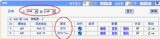 - 经过上面这几个参数的配置后,策略就算是设置完成了,最后点击“确定”按钮就行了。如下图可以看到从WAN——>LAN新增了一条策略,策略的源地址ANY表示任何源地址,发送到目的地址也就是TL-FR5300的WAN口IP ,数据包访问的是HTTP 80端口,那么TL-FR5300就将数据包转发至内网。