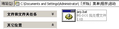 保存之后修改其为.bat后缀的批处理文件,比如“arp.bat”。然后将其放入系统启动项中,以后系统每次开机时都会执行这个绑定命令,将路由器的管理IP和MAC地址进行绑定。如图所示: