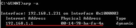 b、如果您在命令行提示符中输入:arp -a,看到网关对应的MAC地址不是路由器的LAN口MAC地址,则是有arp欺骗发生了。如下图。