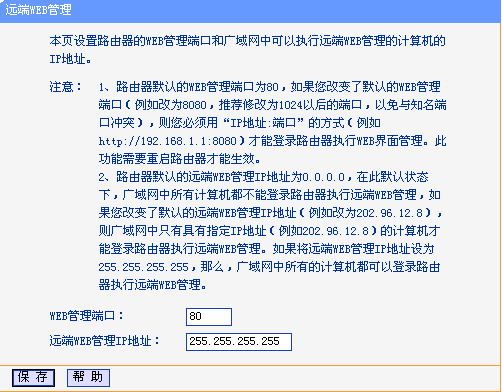 2、路由器默认的远端WEB管理IP地址为0.0.0.0,在此默认状态下,广域网中所有计算机都不能登录路由器执行远端WEB管理,如果改变了默认的远端WEB管理IP地址(例如改为202.96.12.8),则广域网中只有具有指定IP地址(例如202.96.12.8)的计算机才能登录路由器执行远端WEB管理。如果将远端WEB管理IP地址设为255.255.255.255,那么,广域网中所有的计算机都可以登录路由器执行远端WEB管理。