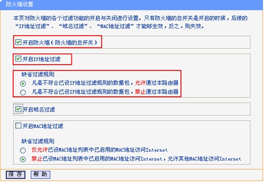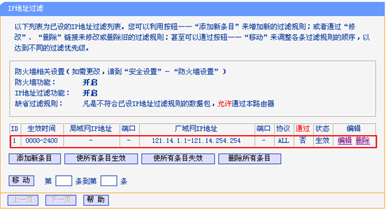 注意这里选择的缺省过滤规则是:凡是不符合已设IP地址过滤规则的数据包,允许通过本路由器。