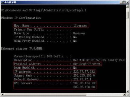 要发现和解决TCP/IP网络问题时,通常首先检查出现问题的计算机上的TCP/IP配置。使用ipconfig /all命令可获得全面的主机配置信息,如下图所示。既包括总体的IP配置信息,如主机名、IP地址、DNS、MAC地址等。