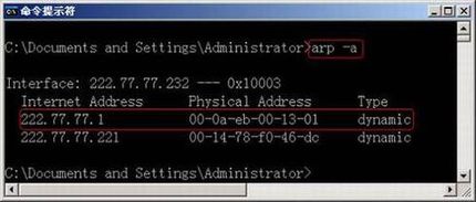 arp命令最常用的是查找同一物理网络上的某主机的MAC地址,并给出相应的IP地址。如果要想确定另外一个主机的MAC地址,通常先ping该主机,然后使用命令arp –a命令,如下图所示: