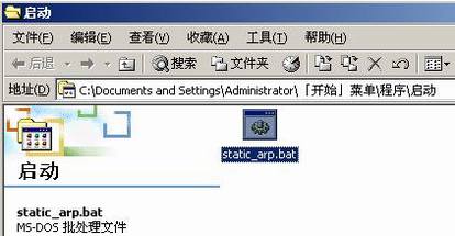 保存就可以了,以后可以通过双击它来执行这条命令,还可以把它放置到系统的启动目录下来实现启动时自己执行。打开电脑“开始”->“程序”,双击“启动”打开启动的文件夹目录,把刚才建立的static_arp.bat复制到里面去: