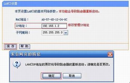 登录路由器的管理界面,点击 网络参数 >> LAN口设置,修改IP地址(如主路由器的IP地址是192.168.1.1,则副路由器修改为192.168.1.2),保存并重启路由器。