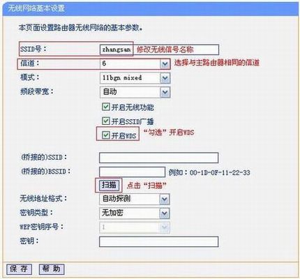 使用修改后的IP地址登录路由器管理界面,点击 无线设置 >> 无线基本设置,设置与主路由器相同的 SSID号 及 信道,勾选 开启WDS,点击 扫描。