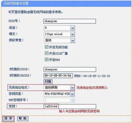 在 密钥 位置输入主路由器的无线密码,输入完成后点击 保存。