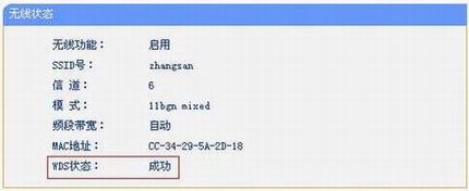 重启完成后,在路由器的管理界面,点击 运行状态,观察 无线状态 >> WDS状态,显示 成功 则表示桥接WDS设置成功。