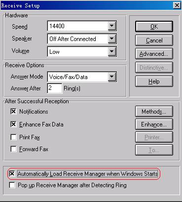 如果您使用没有语音功能的传真调制解调器,安装程序就会自动设置“接收管理器”仅应答传真。