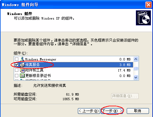勾选传真服务,点击下一步,按照提示操作(该过程需要插入WINDOWS的安装光盘),最后完成添加向导。