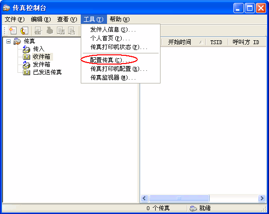 开始->程序->附件->通讯->传真->传真控制台,工具-配置传真。