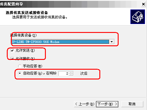 勾选“允许发送”、“允许接收”,接收传真选择自动应答(可以设置响铃N次之后自动应答)或者手动应答,下一步。