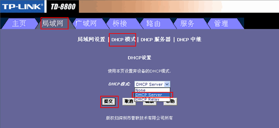 局域网-DHCP模式,选择DHCP Server,点击提交保存。开启TD-8800的DHCP服务,内网PC便可以从TD-8800自动获取IP地址。