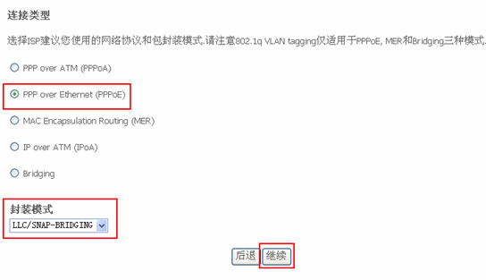 连接类型PPPoE,封装模式LLC/SNAP-BRIDGING,点击继续。