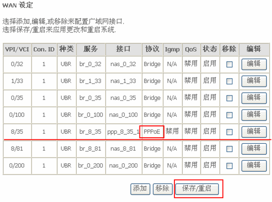 回到WAN设定页面,此时可以看到设置的VPI/VCI条目协议为PPPoE,点击保存/重启,设备重启后设置生效。
