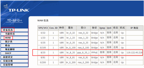 设备信息-WAN查看WAN口信息,如果VPI/VCI条目-IP地址显示出IP地址,说明设备已经拨号成功。