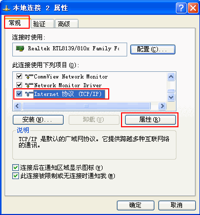 选择“属性”-“常规”-“Internet协议(TCP/IP)”,点击“属性”。