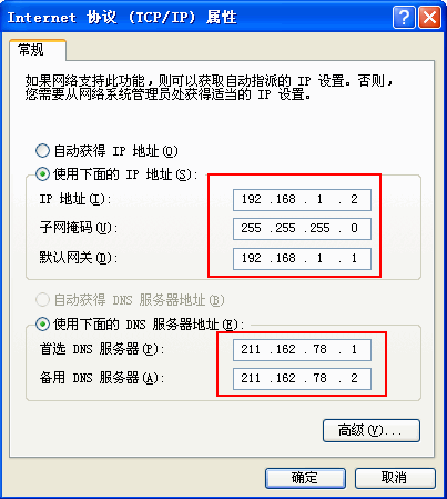 填入IP地址192.168.1.2,子网掩码255.255.255.0,默认网关192.168.1.1。