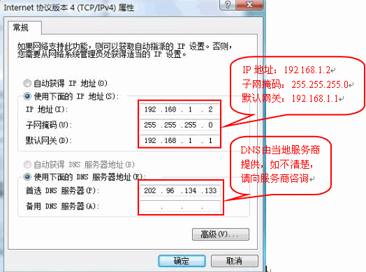 注意:在 “使用下面的DNS服务器地址”中填入当地的DNS服务器地址,如不清楚请咨询当地服务商。