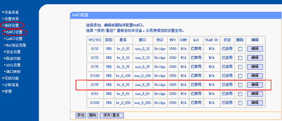 选择正确的VPI/VCI(对应当地服务商的VPI/VCI值,如不清楚请咨询服务商,这里以8/35为例),点击编辑。