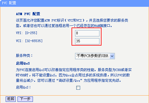 如果您需要的VPI/VCI值不在设备默认提供的条目中,可以在该步骤中修改,服务种类保持默认,点击下一步。