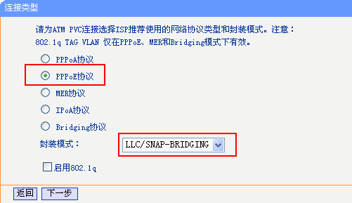 选择PPPoE协议,封装模式为LLC/SNAP-BRIDGING,点击下一步。