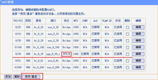 回到WAN口设置主页面,可以看到设置的VPI/VCI对应协议已变成PPPoE,点击保存/重启,设备会进行重启。