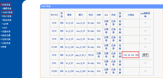 在设备信息-WAN口信息中查看,设置的VPI/VCI-IP地址显示出IP地址,说明设备已经拨号成功。