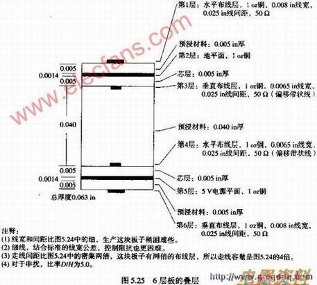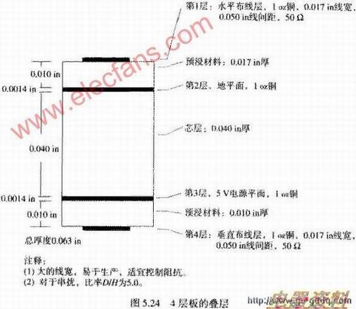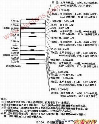 图5.24到5.26举例说明了分别为4层、6层和10层的三个板子的经典 叠层 布局。在下面描述的这些双层设计中,使用通常的环氧的环氧树脂多层制造方法,超过了10层、设计者通常结合使用另外的地平面隔离布线层。