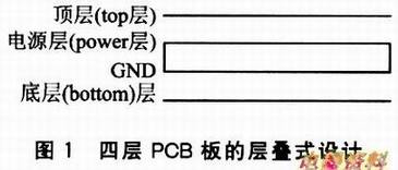 DSP高速数字电路中,为了提高信号质量,降低布线难度,增加系统的,一般采用多层板的层叠式设计。层叠式设计可以提供最短的回流路径,减小耦合面积,抑制差模干扰。在层叠式设计中,分配专门的电源层和地层,并且地层和电源层紧耦合对抑制共模干扰有好处(利用相邻的平面降低电源平面交流阻抗)。以图1所示的4层板为例来说明层叠式的设计方案。